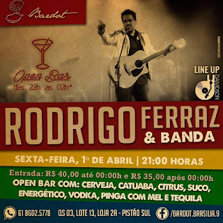 Pela segunda vez no Bardot Pub, Rodrigo Ferraz e Banda preparam para o público mais um show contagiante e envolvente. Nesta sexta (01/04), às 0h, o cantor subirá ao palco com repertório variado que inclui sucessos sertanejos, desde o mais antigo até o atual, passando pelos ritmos pop rock e clássicos da MPB. A festa contará com a apresentação do DJ Daividson, que promete ferver a pista com muito axé, pop e funk. Entrada a R$ 40,00 (até às 0h) e R$ 35,00 (após às 0h), com open bar, das 22h às 2h, incluindo cerveja, catuaba, citrus, suco, energético, vodka, pinga com mel e tequila. Casa aberta a partir das 21h. Classificação 18 anos.