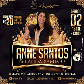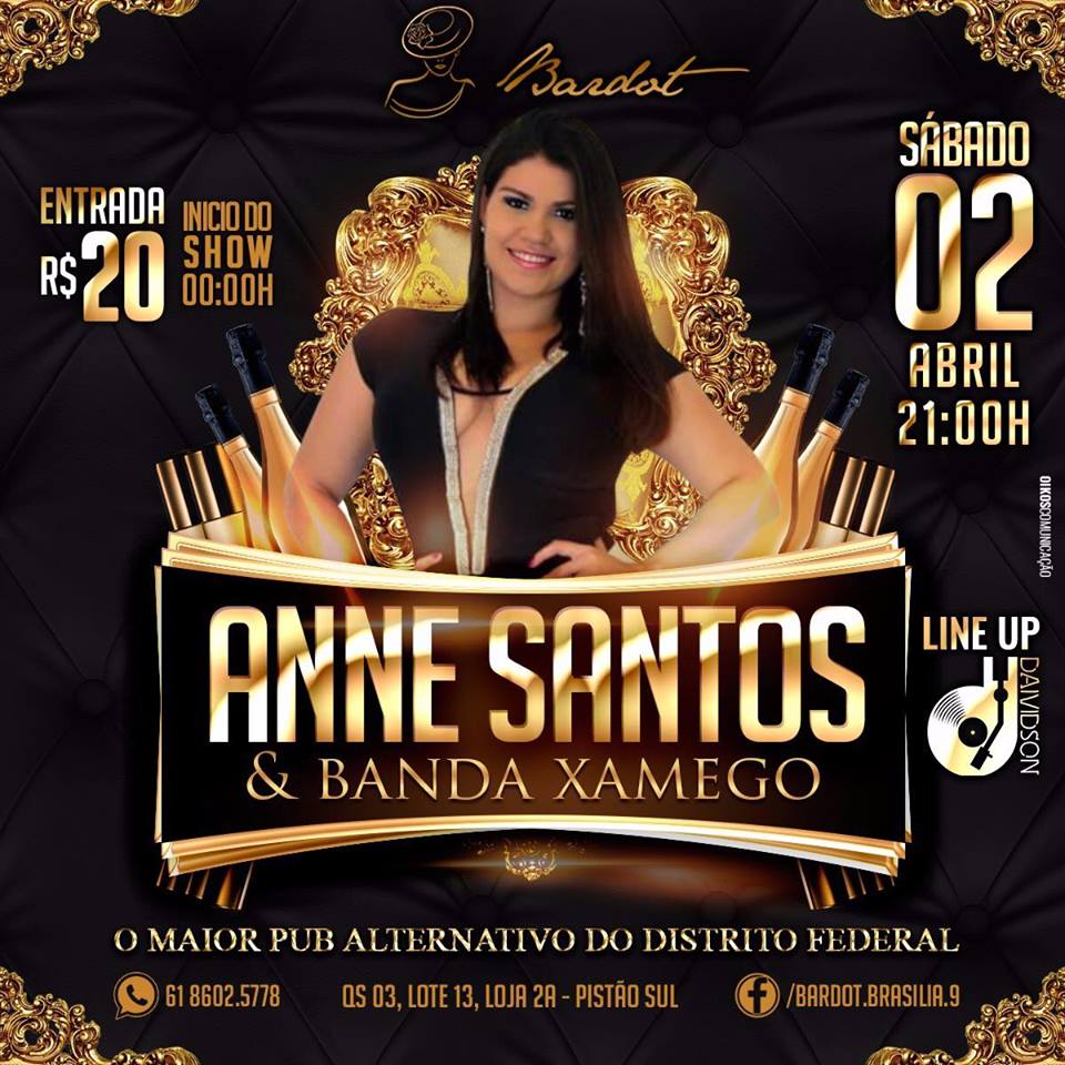 Acompanhando a renovação do celeiro musical de Brasília, o Bardot Pub contará esta semana com uma nova atração: a pernambucana Anne Santos. A programação vai de sexta a domingo (01 a 03/04), com participações de Rodrigo Ferraz e Banda (sexta, com open bar), seguida por Anne Santos e Banda Xamego (sábado), a novidade da casa. No domingo a festa fica por conta de Marlon Monteiro (open bar), já conhecido do público alternativo. A casa abre a partir das 21h (sexta e sábado) e às 20h aos domingos. Classificação 18 anos.