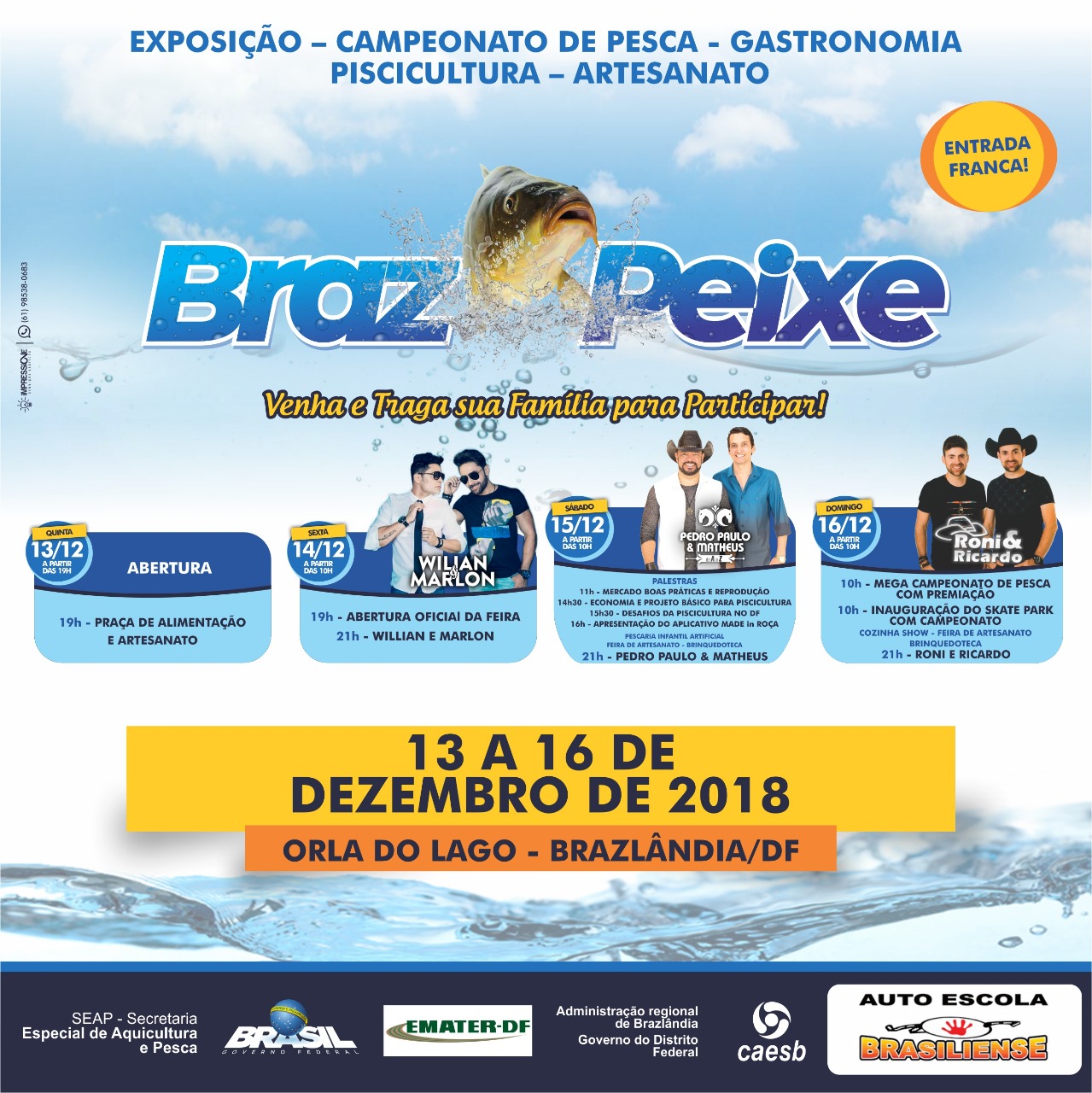 Mega feira de pescado promete movimentar o Distrito Federal no período de 13 a 16 de dezembro, na Orla do Lago, em Brazlândia. Com mais de 20 estantes, a programação da Brazpeixe conta com exposições, palestras, cursos de gastronomia, piscicultura, artesanato e shows com as duplas sertanejas Wilian e Marlon, Pedro Paulo e Matheus, e Roni e Ricardo. O encerramento inclui um torneio de pesca aberto ao público, com troféus para primeiro, segundo e terceiro lugar. A entrada é franca e a classificação livre.
