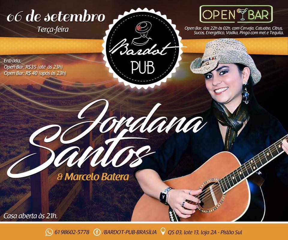 Apresentação de peso da casa, Jordana Santos será a encarregada da festa de véspera de feriado nesta terça (06/09), no Bardot Pub. A goiana se apresentará com banda a partir das 23h30 e promete um show eclético e dançante. O repertório garante os sucessos 10% (Maiara e Maísa), Alô Porteiro (Marília Mendonça) e Tim Tim Tim (Wesley Safadão). No som mecânico, DJ Daivisson irá dar continuidade à festa com muito pop e funk. Entrada a R$ 35,00 (até às 23h) e R$ 40,00 (a partir das 23h), com open bar, das 22h às 2h, incluindo cerveja, catuaba, citrus, suco, energético, vodka, pinga com mel e tequila. Casa aberta às 21h. Classificação: 18 anos.