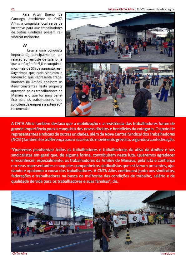 “Queremos parabenizar todos os trabalhadores e trabalhadoras da ativa da AmBev e aos sindicalistas em geral que, de alguma forma, contribuíram nesta luta. Queremos agradecer e reconhecer, especialmente, os trabalhadores da AmBev de Manaus, pela luta e confiança em seus representantes e naqueles companheiros sindicalistas que estiveram presentes, ajudando e apoiando a causa dos trabalhadores. A CNTA Afins continuará junto aos sindicatos, federações e trabalhadores na busca de melhorias das condições de trabalho, salário e de qualidade de vida para os trabalhadores e suas famílias”, diz.