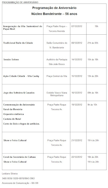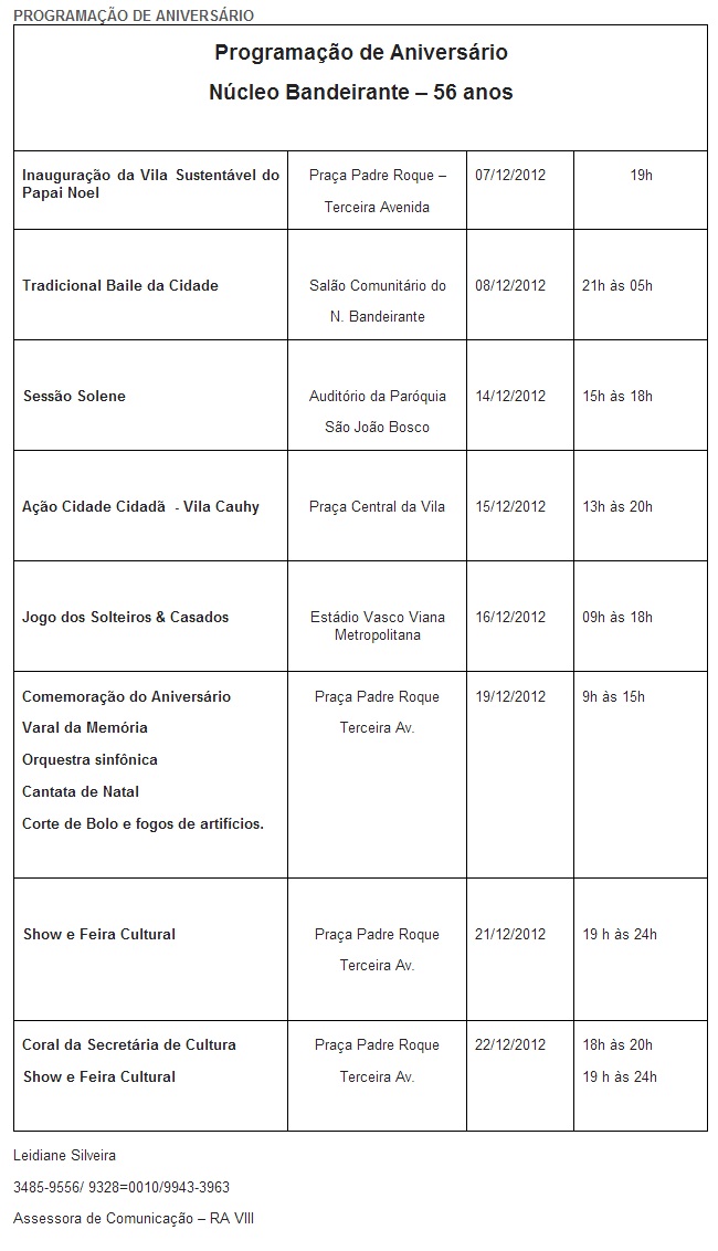 No dia 07 de dezembro (sexta-feira), às 19h, o Papai Noel vai chegar ao Núcleo Bandeirante para inaugurar sua Vila Sustentável, na Praça Padre Roque – Terceira Avenida. A inauguração faz parte das comemorações de aniversário dos 56 anos do Núcleo Bandeirante, no próximo dia 19 de dezembro. “Comemore o aniversário da cidade que faz mais pelo Meio Ambiente” é a chamada da campanha comemorativa.