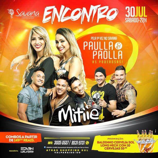 Com músicas autorais e estilo próprio embalado pelo “forrónejo”, Paulla & Paolla se apresentam pela primeira vez em Valparaíso (GO). O show das loiras será neste sábado (30/07), às 22h, no Savana Lounge & Bar, com participação do grupo Mitiê (swingueira). A festa Encontro também contará com o som do DJ residente Edvan Malvera, que promete agitar a casa com hits diversificados. Entrada a R$ 10,00 feminino e R$ 20,00 masculino (até às 23h) e R$ 20,00 feminino e R$ 30,00 masculino (após às 23h). Valores sujeitos a alteração sem prévio aviso. Classificação: 18 anos.