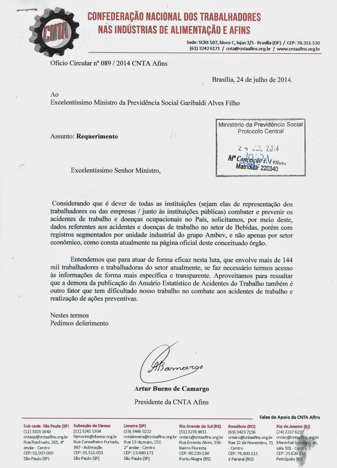 “Entendemos que para atuar de forma eficaz nesta luta, que envolve mais de 144 mil trabalhadores e trabalhadoras do setor (bebidas) atualmente, se faz necessário termos acesso às informações de forma mais específica e transparente. Aproveitamos para ressaltar que a demora da publicação do Anuário Estatístico de Acidentes do Trabalho também é outro fator que tem dificultado nosso trabalho no combate aos acidentes de trabalho e realização de ações preventivas.”, diz documento assinado pela CNTA Afins.